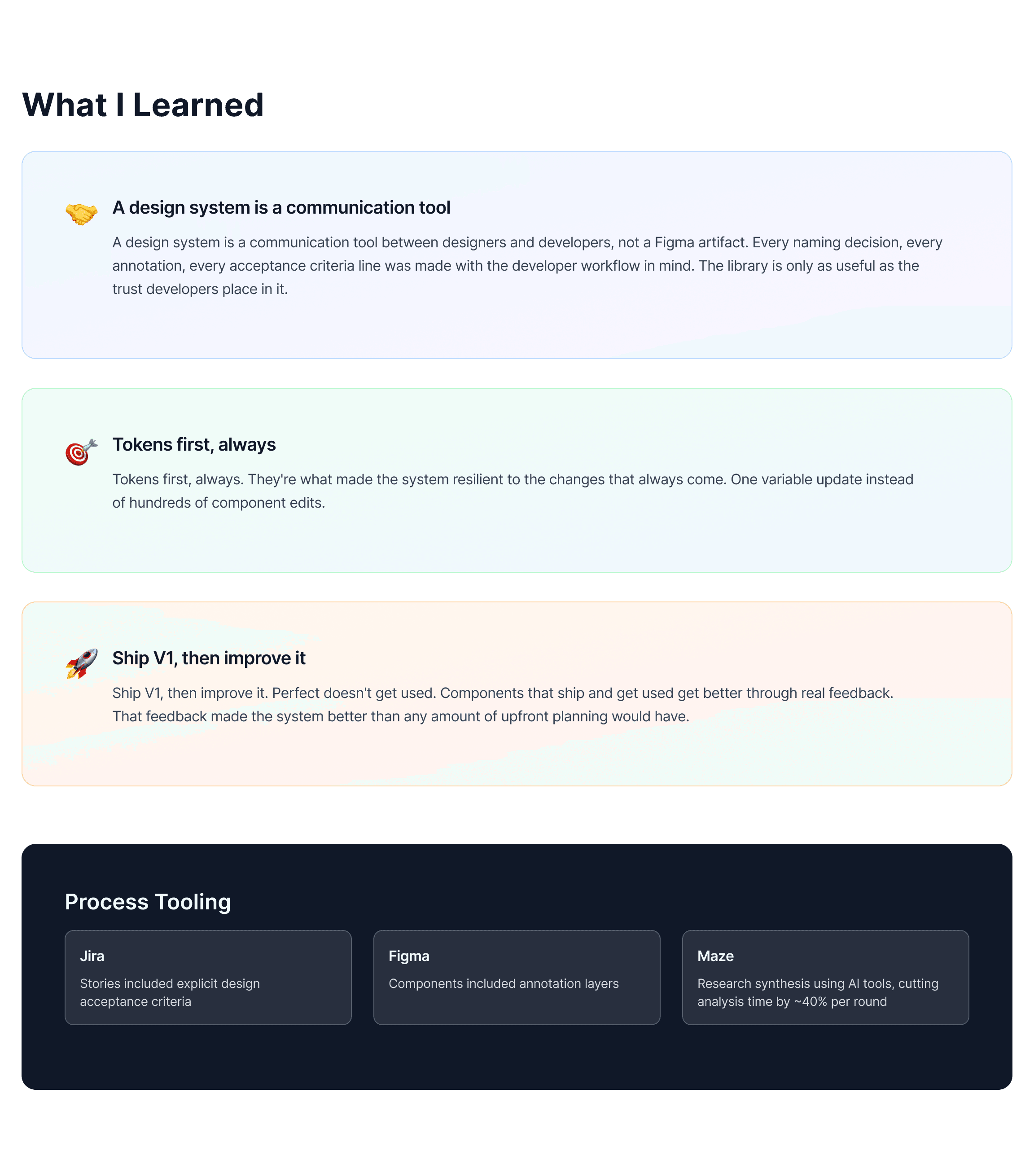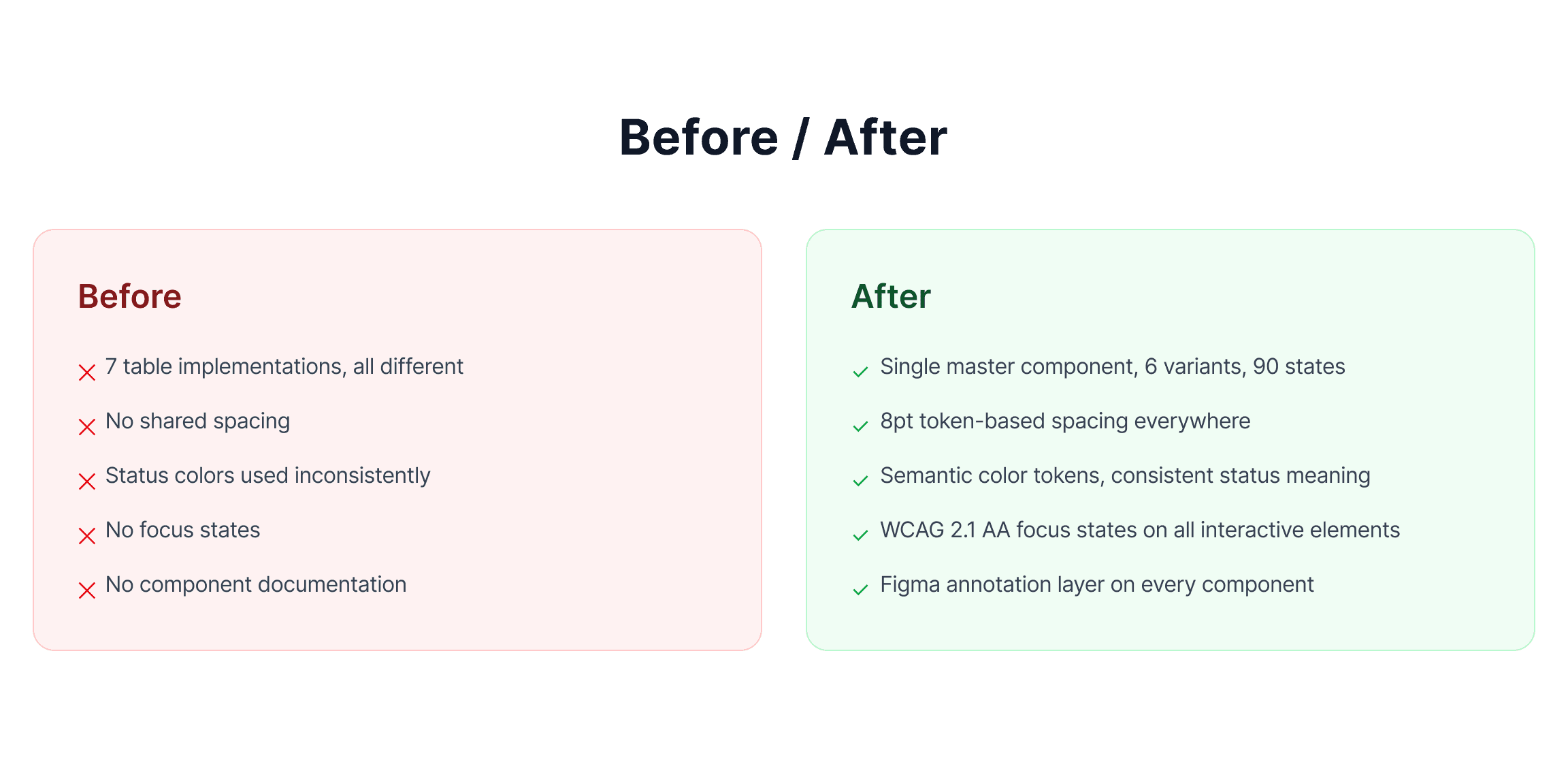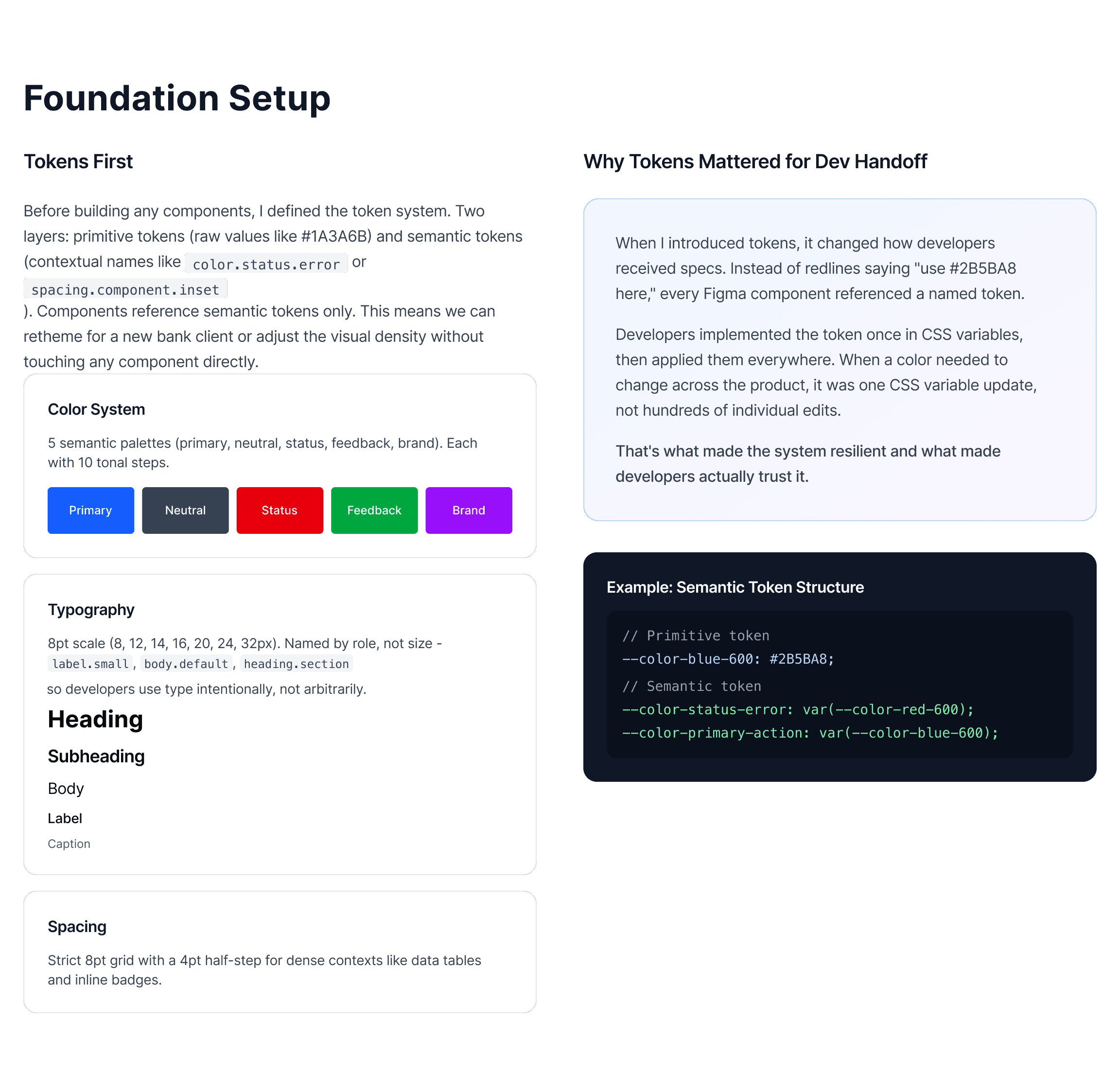Building a design system from scratch for an enterprise fintech platform with no shared components, no tokens, and no documentation.